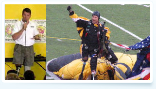 A breathtaking, inspirational sight, and the perfect way to begin an unforgettable keynote with Dana. He can skydive into your event—a grand opening, meeting, or sporting event. All wide-eyed attendees will watch a double-amputee land on a dime—every time.